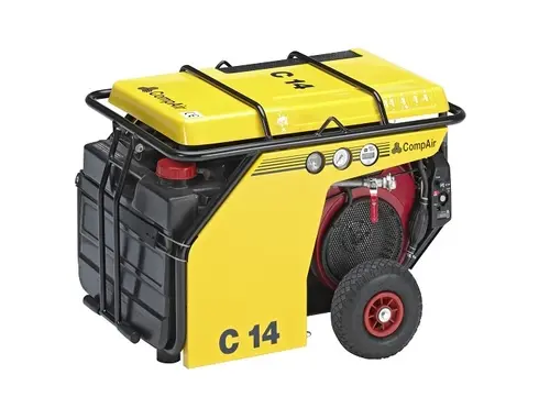 От C10-12 до C14 Объемный расход от 1,0 до 1,4 м/мин Рабочее давление от 7 до 12 бар Мощность двигателя 15,5 кВт Вес брутто 165 кг Приложения Ремонтные/монтажные работы Инструменты для демонтажа и разборки Наземные ракеты Ремонт шин для мобильных грузовиков Прокладка оптоволоконного кабеля Строительные площадки в очень ограниченном пространстве, где требуется очень легкая и компактная машина